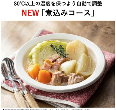 「煮込みコースが最高です!タイマーセットして放置できるから、他の家事をしながら料理ができるんです。吹きこぼれの心配もないから安心して任せられるし、料理の幅が広がりました。」