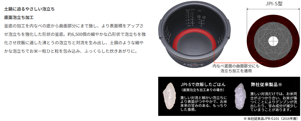 | 内釜の泡立ち加工 | 底面から曲面部分まで泡立ち加工 約6,500個の凸形状 | 底面のみの泡立ち加工 約3,000個の凸形状 |
