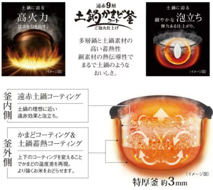 両モデルとも、内釜を包むIHヒーター「釜包みIH」により、加熱面積を広げて加熱量をアップさせ、かまど火に近づけます。