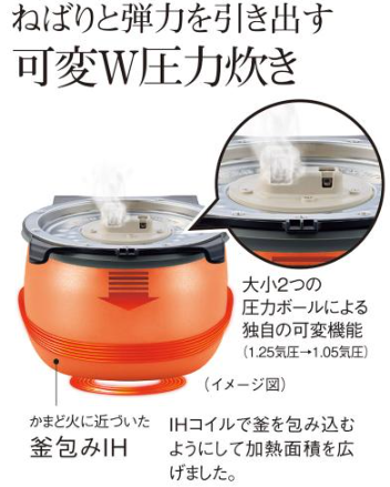 また、大小2つの圧力ボールを制御することで粘りともちもちした弾力を引き出す「可変W圧力」を採用しています。炊飯過程に合わせて2種類の気圧を変化させることで、ごはんのねばりを引き出す仕組みも特徴的です。