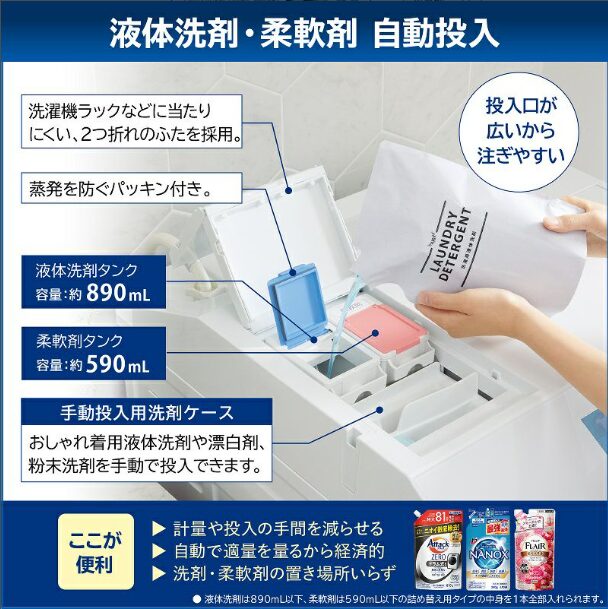 • 「洗剤と柔軟剤の自動投入機能が地味に便利!毎回入れる手間がなくなって時短になります。」
