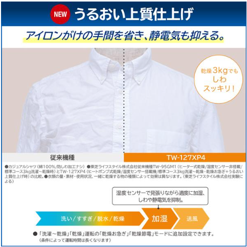 TW-127XP4に追加された「うるおい上質仕上げ」コースは、乾燥後に適度な湿度と温風、やわらかなドラムの動きで衣類やタオルをしっとり・ふんわり仕上げてくれるのが特徴です。